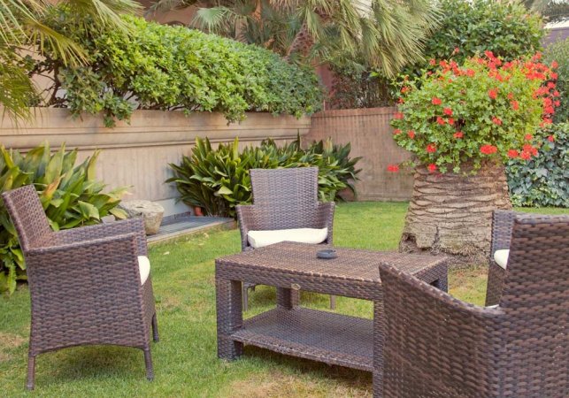 Giardino con sedie e tavolino in vimini, circondato da piante e un cespuglio fiorito.