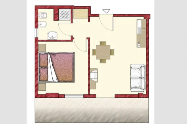 camera matrimoniale, divano letto, angolo cottura, box doccia, balcone arredato.